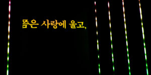 Displayed for the first time at the exhibition 노랫말 – 선율에 삶은 싣다 (Korean pop lyrics, Melodies of life) at the National Hangeul Museum in Seoul, Boundless is an installation combining video projection and LEDs. The video projection part allows for more detailed animations while the LED bars (and their positioning within a given space) expand the room into an immersive experience.