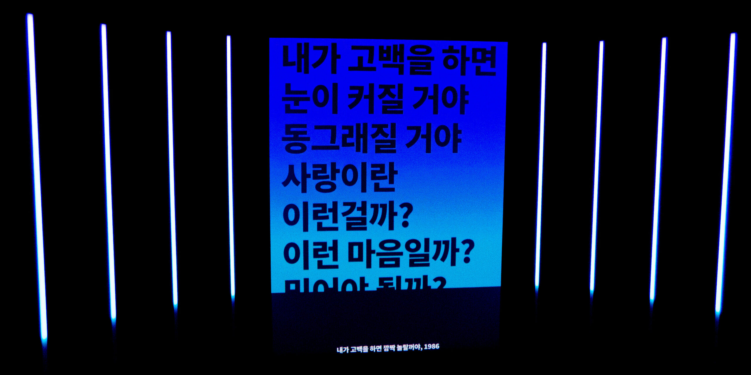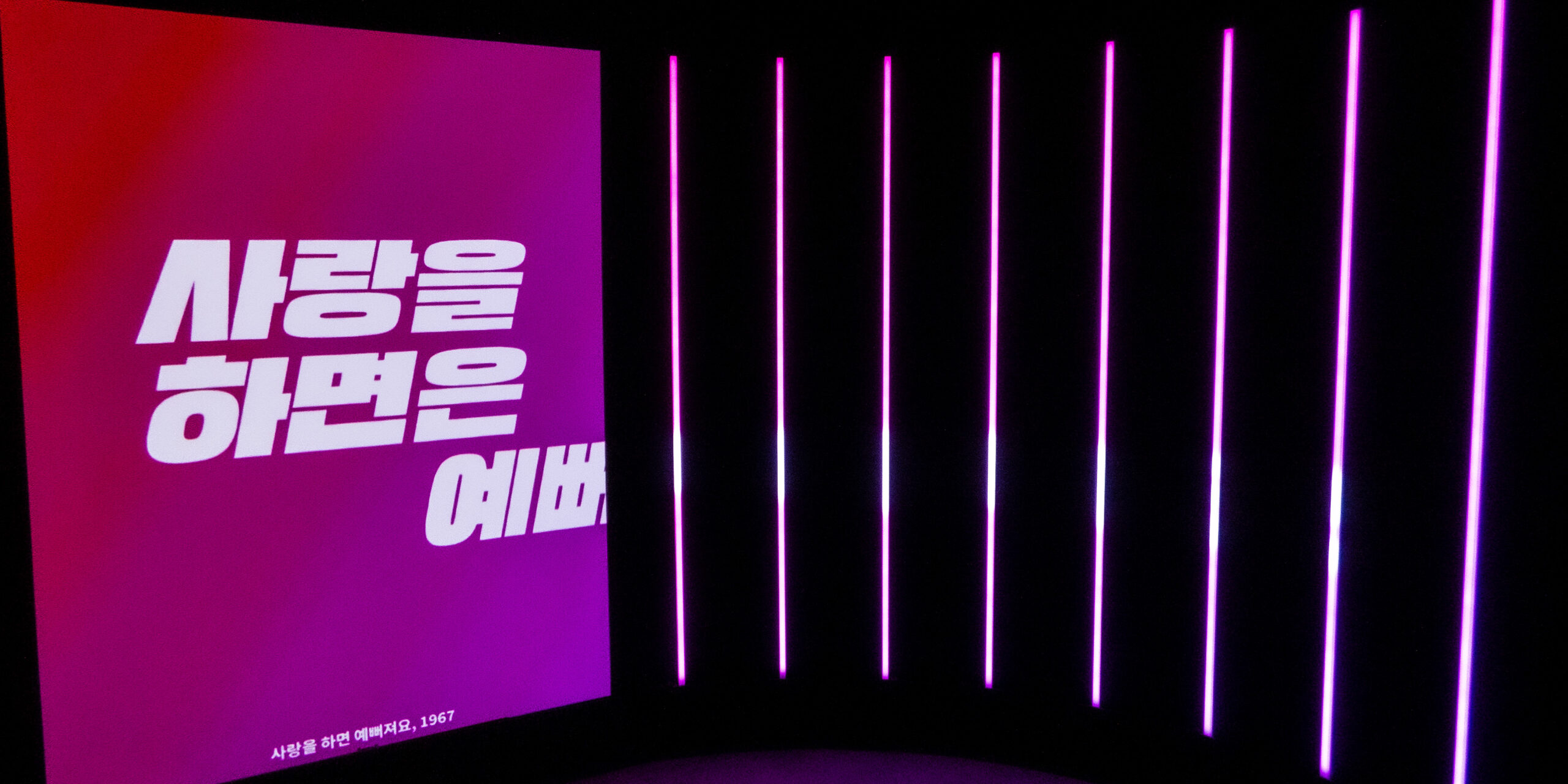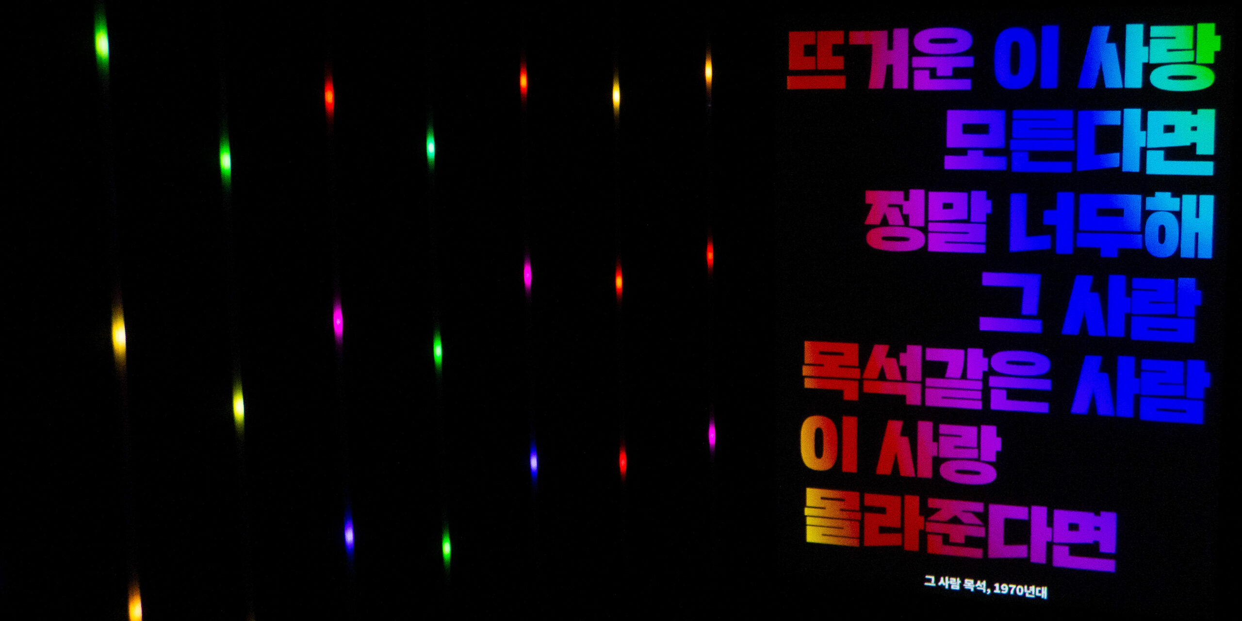In this specific context, Boundless displays excerpts from lyrics of selected Korean love songs emphasising the rhythm and mood of each song through colours, layout and lighting patterns on the LEDs. The whole room lighting up feels like an enthralling karaoke-esque installation transporting the visitors through time revisiting iconic pop songs from the 50s until today, revealing their most noteworthy hooks.