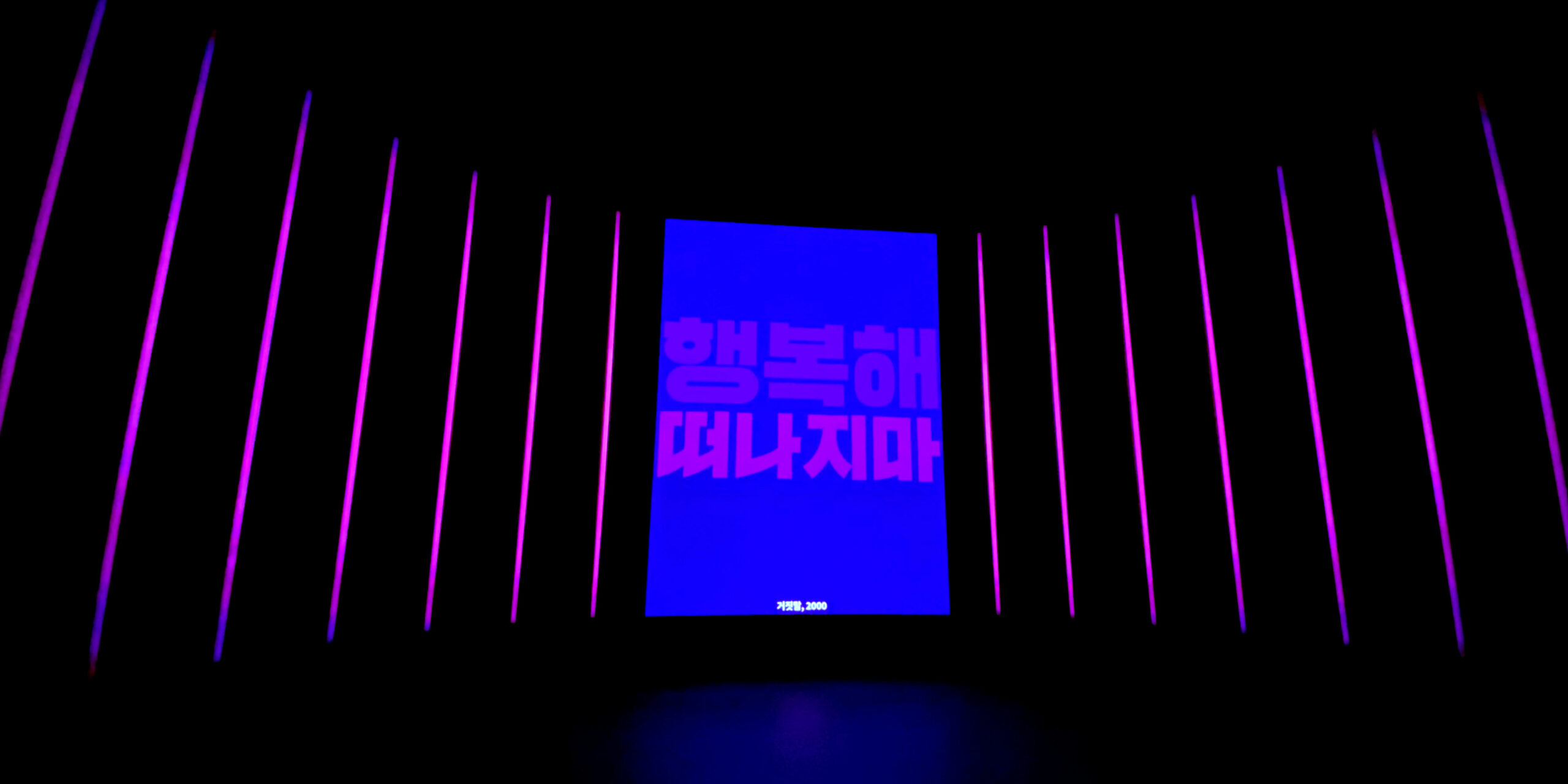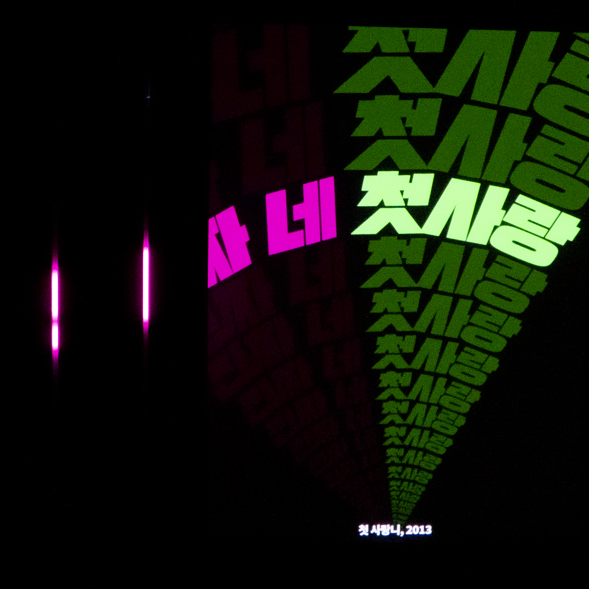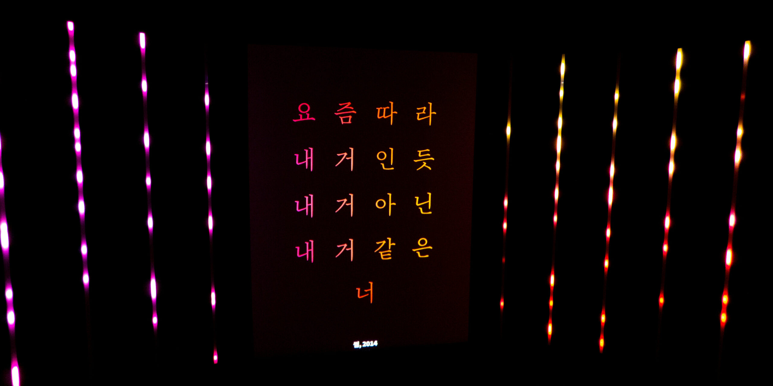 Displayed for the first time at the exhibition 노랫말 – 선율에 삶은 싣다 (Korean pop lyrics, Melodies of life) at the National Hangeul Museum in Seoul, Boundless is an installation combining video projection and LEDs. The video projection part allows for more detailed animations while the LED bars (and their positioning within a given space) expand the room into an immersive experience.