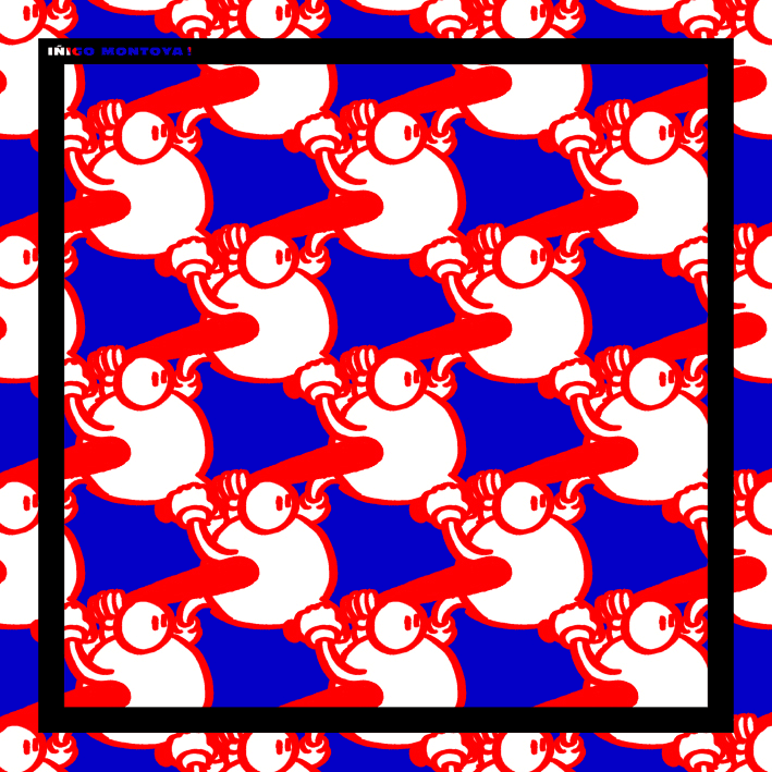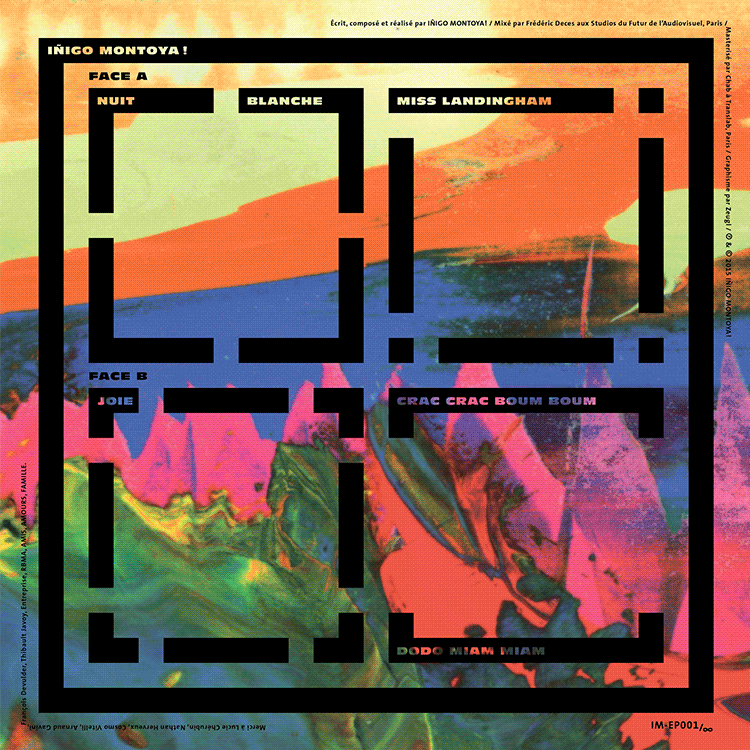 Iñigo Montoya!’s identity comes down to overlaying a set of frames onto an artwork in the background. The frames system constitutes the informative part, it contains all the factual information (band’s name, track’s title, etc), whereas the background artwork (illustration, pattern, video, etc) allows for a more expressive representation of the track or of the release. Each frame composition is unique to the release whereas the subjective part can change from one visual to another for the same release. Through this concept we highlight that there can be different interpretations to one song.