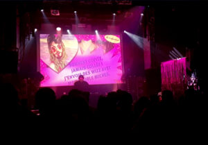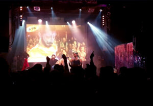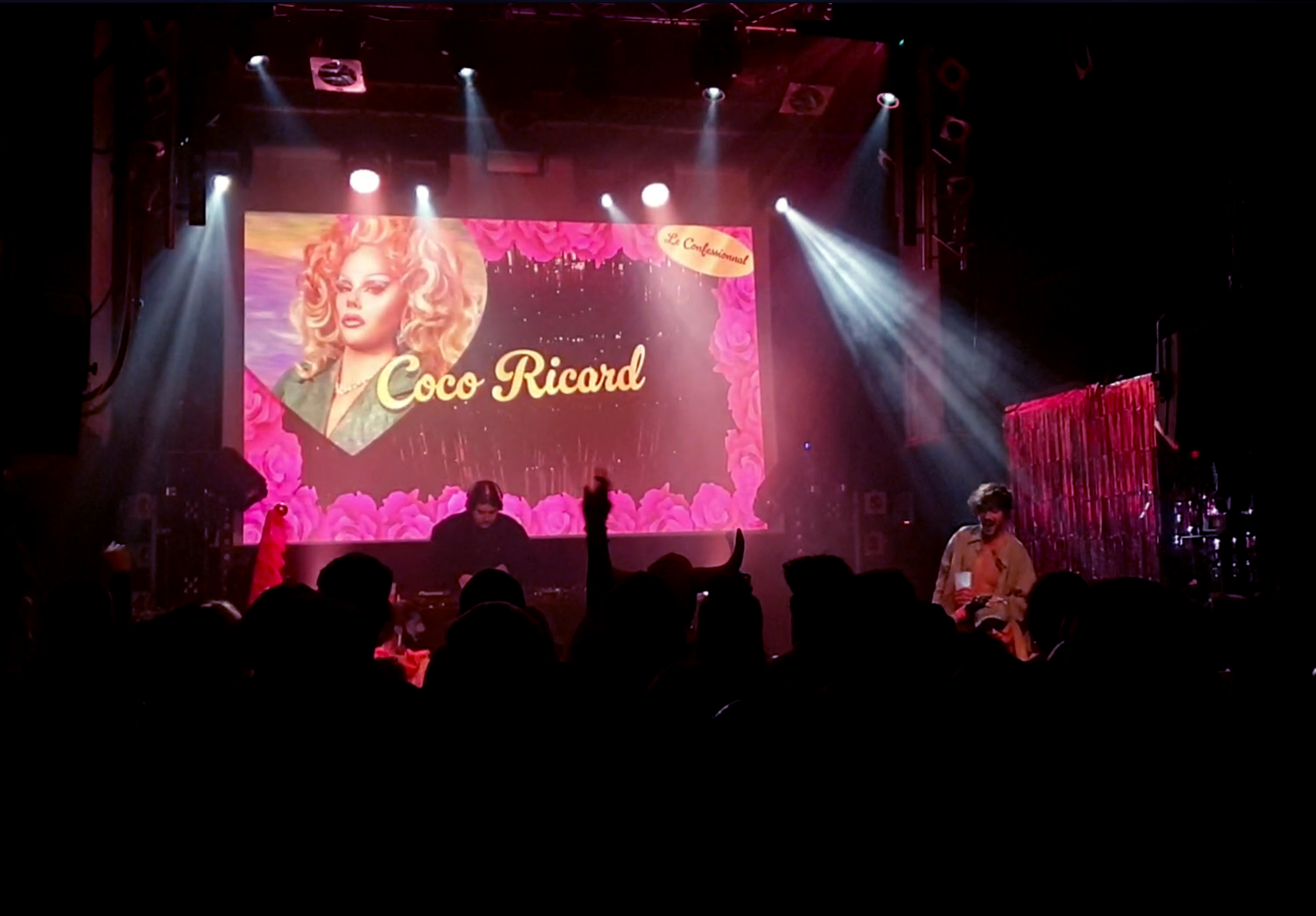 Video installation for a Kindergarten Party club night themed around reality TV shows. The set-up allows to switch between two videos signals, one being the ‘confessional’ and the other, a tracking camera held by the performers allowing them to zoom in or to follow specific actions taking place on stage. We created and managed the set-up the whole night and adorned the screens with kitsch graphics parodying romantic reality TV shows.