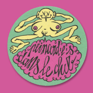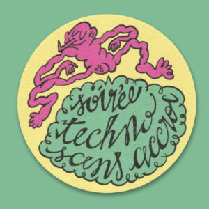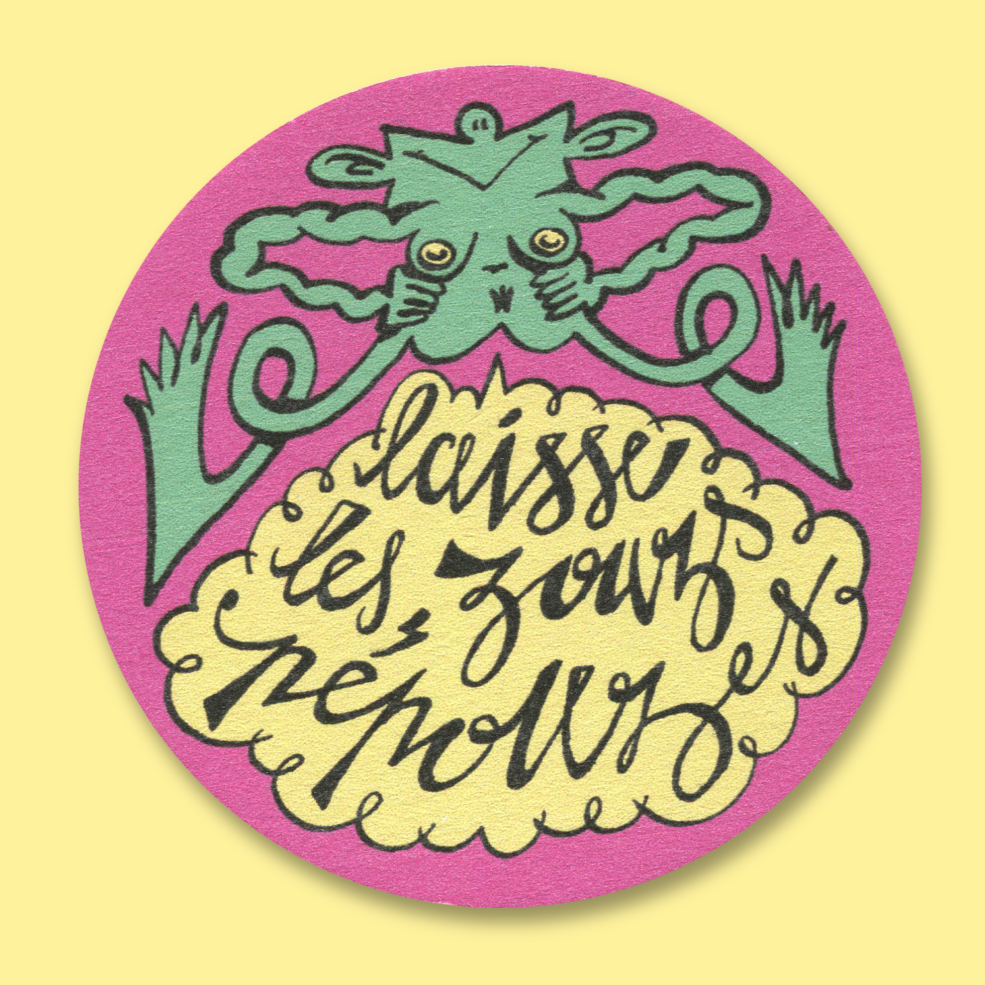 Coasters for French feminist collective Les Pétroleuzes, featuring a series of gender-inclusive characters farting their advice for safe partying.